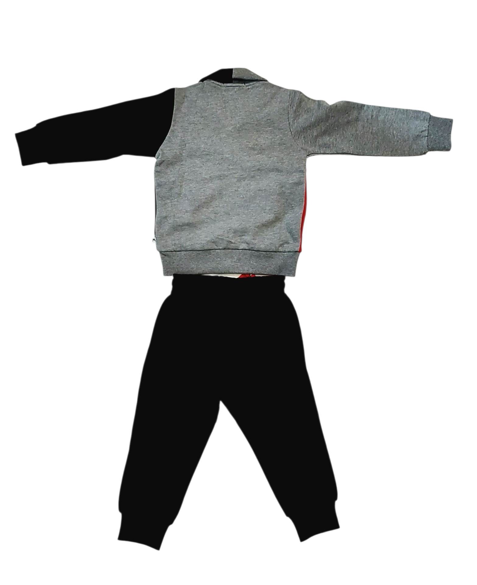 Tuta felpata con zip, colori nero,rosso e grigio.