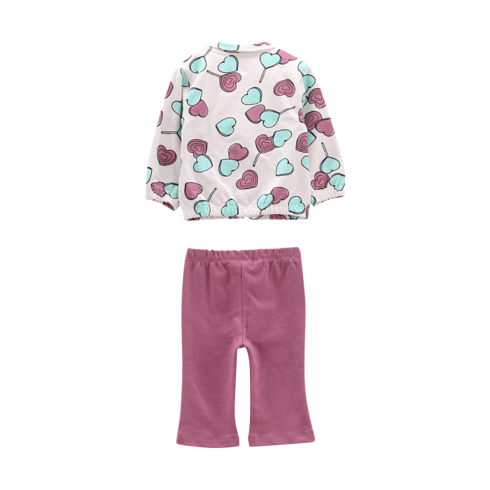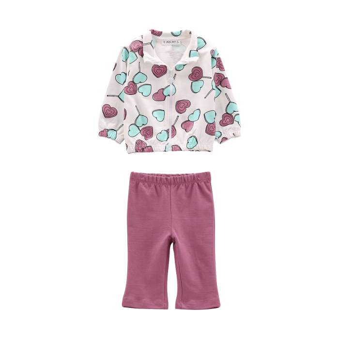 Tuta 2 pezzi per neonata, realizzata in morbida felpa 100% cotone e composta da una felpa full-zip e da un pantalone lungo taglio flare. La romantica stampa allover sulla felpa viene ripresa dalla tinta unita del pantalone.