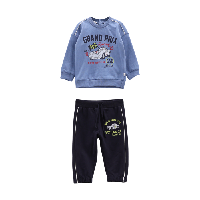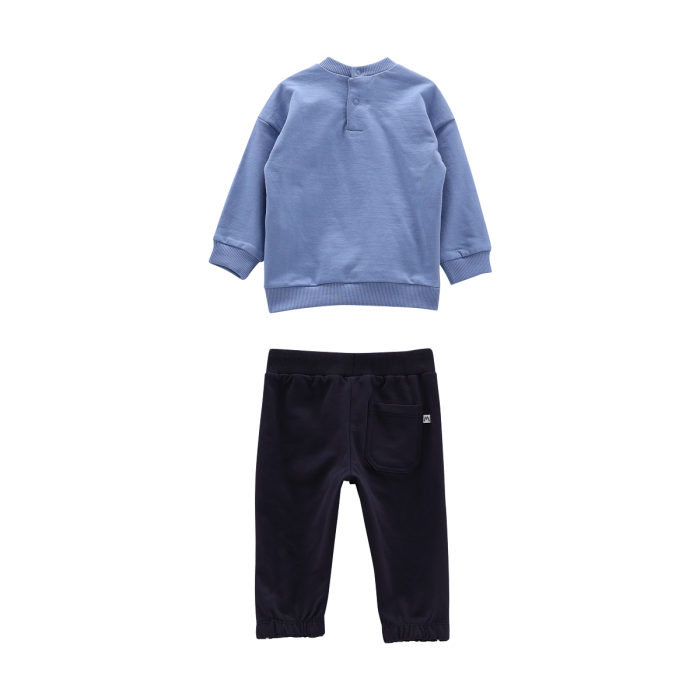 Tuta 2 pezzi per neonato, realizzata in morbida felpa 100% cotone e composta da una felpa girocollo a maniche lunghe e da un pantalone lungo. Lavorazione in costina su collo, polsini e fondo maglia. Pantalone con vita elasticata con coulisse interna. Pratica apertura con bottoncino sul retro della maglia.