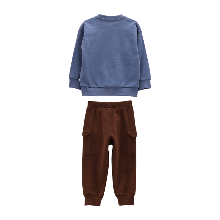 Tuta 2 pezzi per bambino, realizzata in felpa invernale e composta da un pantalone taglio jogger con tasconi cargo in tinta unita e da una maglia girocollo con simpatica stampa dai dettagli in rilievo a tema dinosauri. Lavorazione in costina su colletto, polsi e fondo maglia.