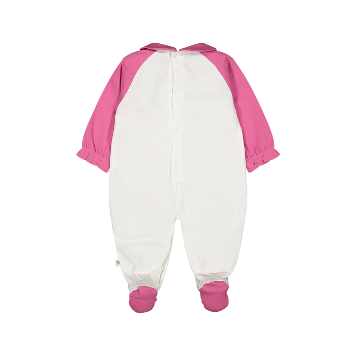Tutina con piede per neonata, realizzata in jersey di cotone stretch. Collo rotondo e maniche a raglan in contrasto di colore, abbottonatura sul retro con pratici bottoncini automatici. Stampa di dolci tigrotti sul lato frontale.