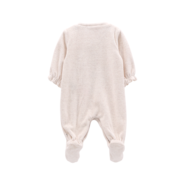 Tutina con piede in ciniglia per neonata, con vezzose ruches sui polsini e sul colletto. Tenere applicazioni frontali, pratica apertura a bottoncini sul lato frontale.