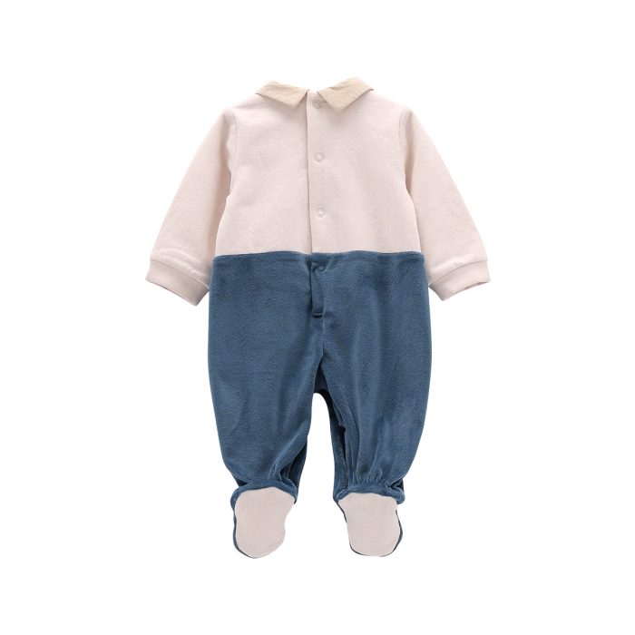Tutina bicolore con piede per neonato, realizzata in ciniglia soft nella parte inferiore e in felpa stretch invernale in quella superiore. Colletto a camicia in costina, tenera stampa frontale.